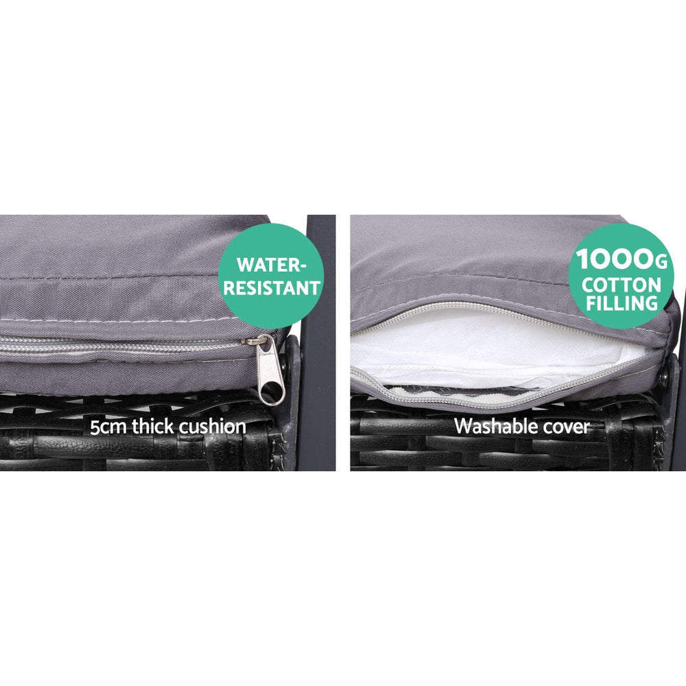 Great for any balcony or patio area, our Gardeon 4-pc Outdoor Set simply looks inviting and elegant from any angle. From its sturdy powder-coated frame and UV-resistant PE wicker to the ultra-comfortable 1000g cotton-filled 5cm thickness cushions and 5mm tempered glass table top, the set is simply finished in extraordinary workmanship. The cushion covers are almost removable and washable for easy maintenance. Best of all, you need not use it just for the outdoors, as this marvellous set is just as appealing in your living room, bedroom or any room that deserves its fine presence.