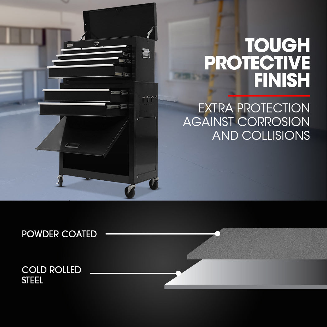 Both the cabinet and chest are built with high tensile powder coated steel enclosures. Equipped with an EVA mat, each drawer slides effortlessly in and out on smooth ball bearing rails, which makes finding and accessing each tool a cinch. The cabinet also comes with 3 pegs and the chest is easily transportable thanks to its side carry handles.