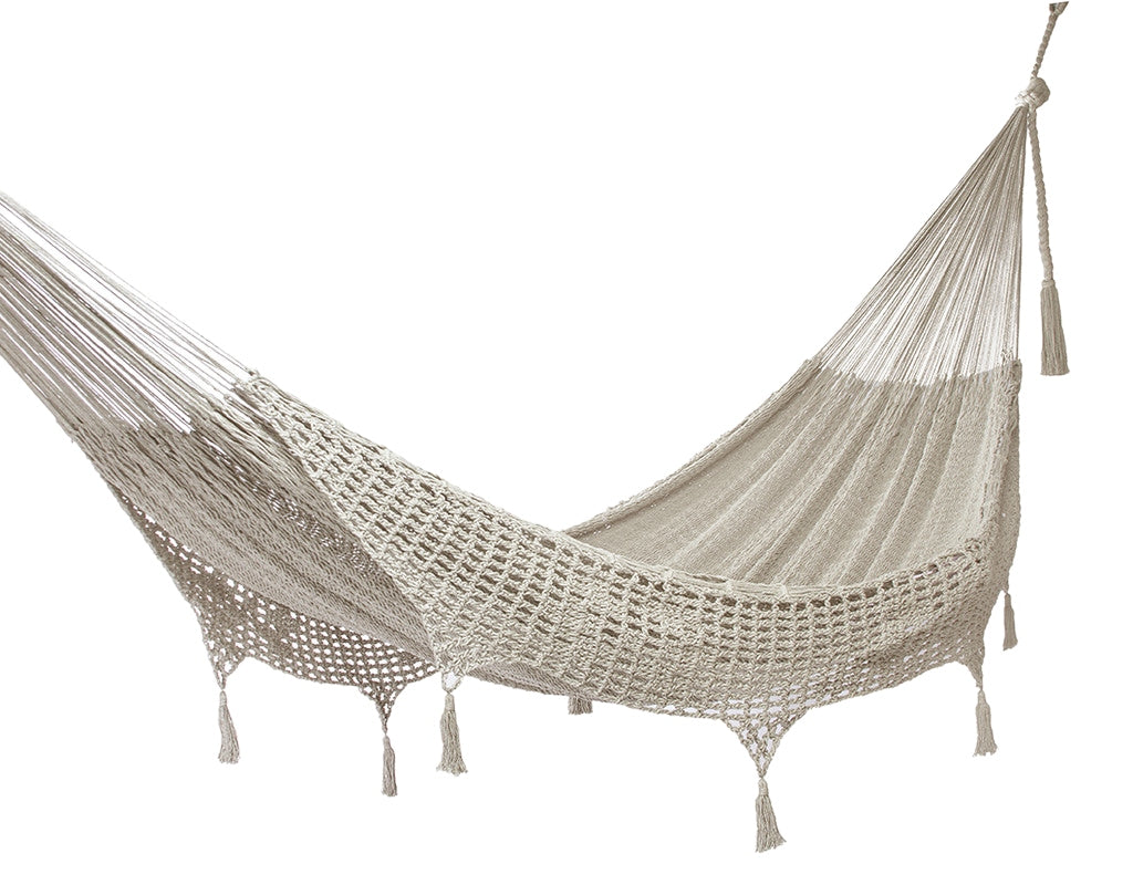 This gorgeous generous-sized hammock will quickly turn into your new favorite afternoon spot. Mayan Legacy artists hand-weave it from 100% cotton rope in elegant colours and add a beautiful crocheted fringe with tassels and floral designs for a glamorous finish. Just add a pair of straps or a frame and enjoy.