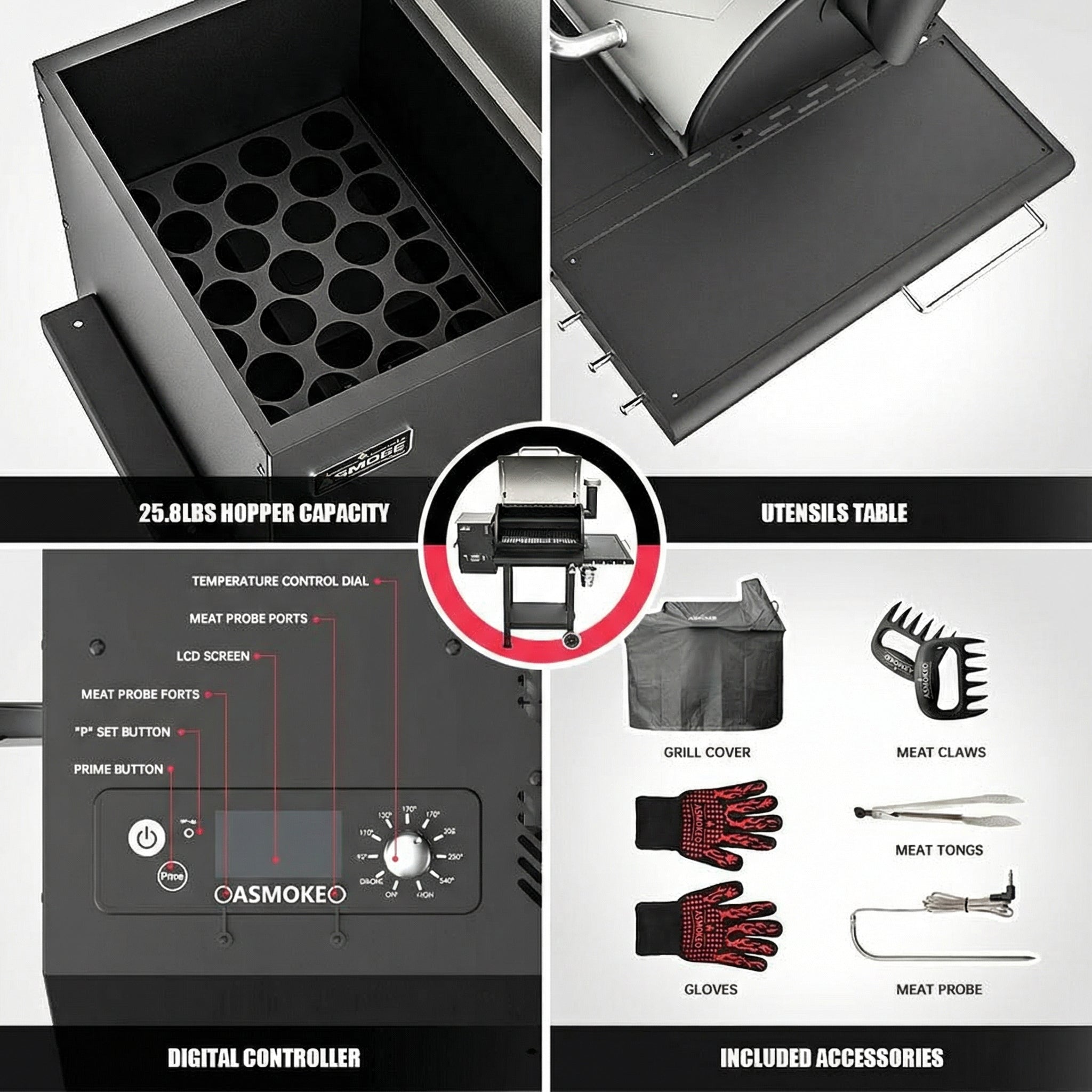 484 Square Inch Main Rack + 216 Square Inch Insulation Rack,Totaling To 700 Square Inches. Ideal For A Larger 3-12 Member Get-Together. Featuring A Whopping 25.8LBS Hopper Capacity Makes It Ideal For Continuous Smoking.