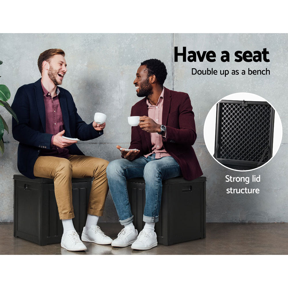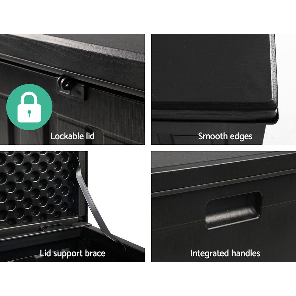 Maximize space and minimize clutter with our outdoor storage box. Crafted from eco-friendly PP plastic and durable steel, this sturdy container can withstand any weather conditions. No tools are needed for easy assembly, and with a generous 80-litre capacity, it can hold a variety of items such as gardening tools, toys, and collectibles. The lid support braces and integrated handles make it even more convenient to use, while the maximum weight capacity of 90kg also allows it to double as a bench. Its elegant rattan-like exterior adds a touch of style to any indoor or outdoor setting.