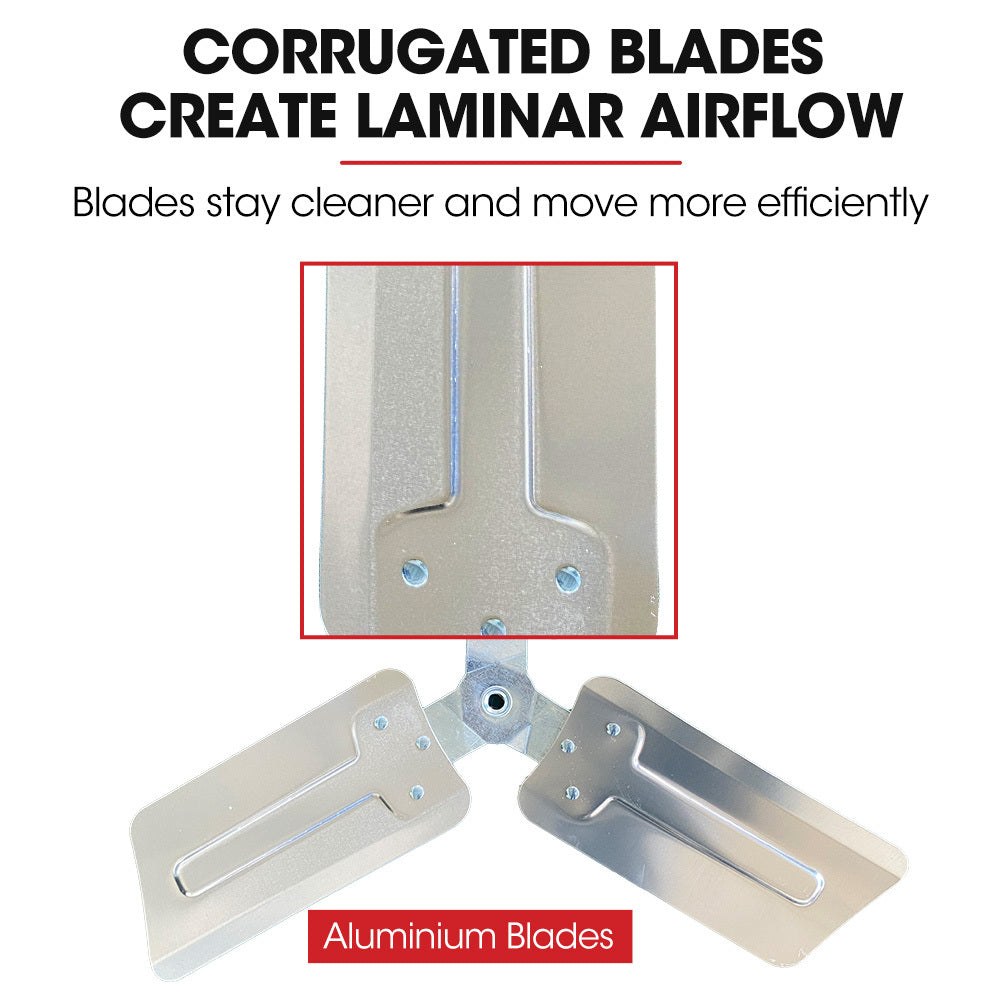 The heavy-duty all-metal construction with powder-coated diamond plate steel drum, offers long-lasting durability and corrosion resistance. The aluminium blades are designed to handle tough conditions while providing smooth and efficient airflow. The chrome steel guard and frame ensure extra protection and stability.