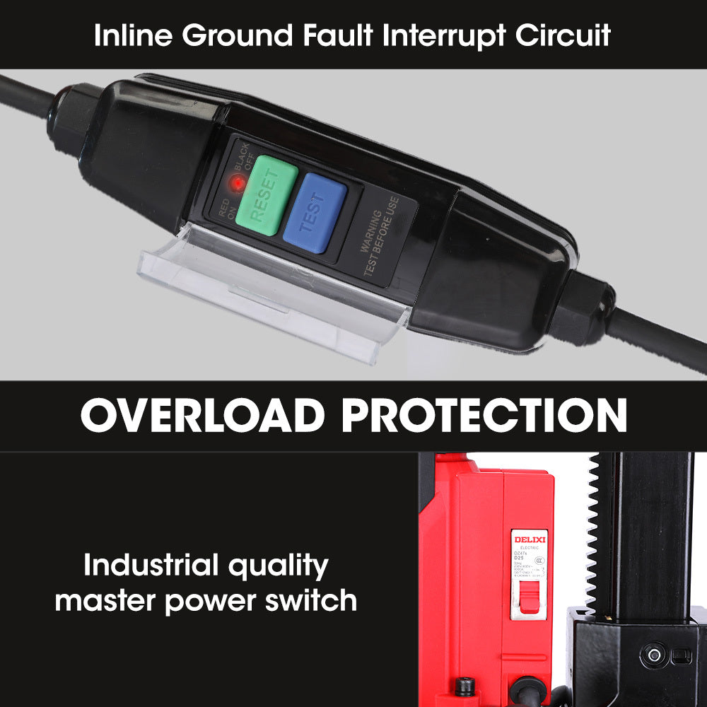 Designed to provide the ultimate user experience, this wet-core drilling machine has a range of thoughtful features. The non-slip handle ensures a secure grip, allowing for precise control and reducing fatigue during extended usage. The inline circuit interrupt switch has an overload protector preventing motor damage. The on/off switch is chassis mounted which adds an extra layer of safety. The double insulation on the motor provides machine and operator protection, ensuring the utmost safety for the operator.