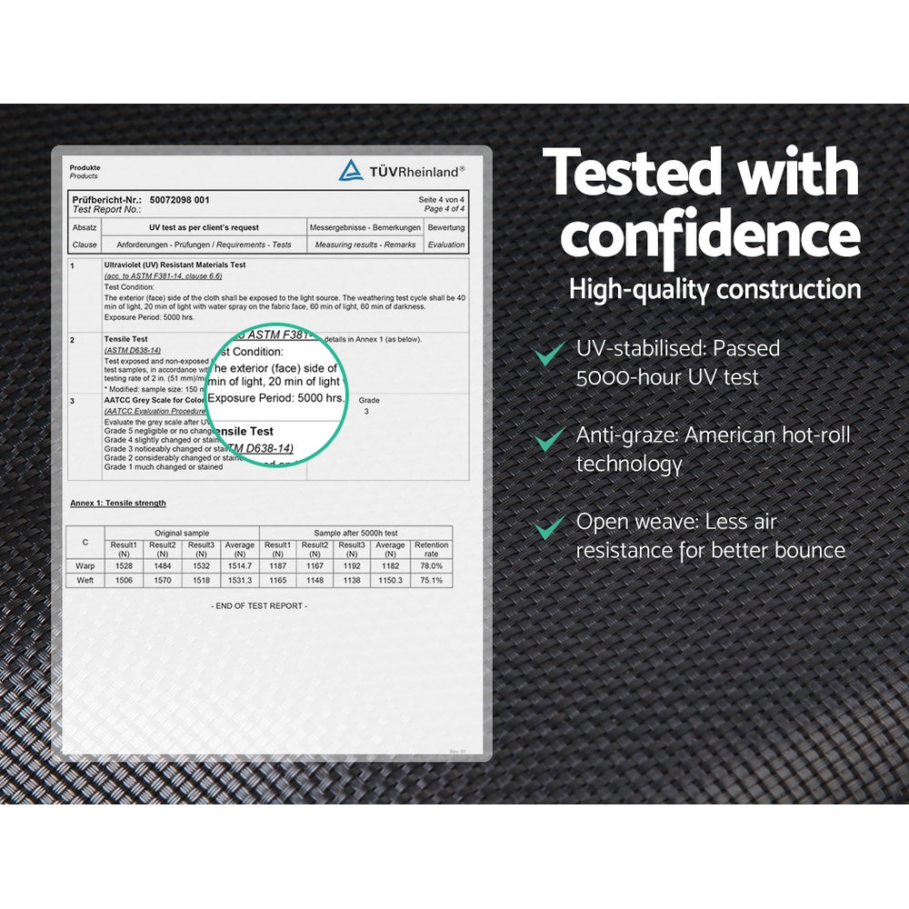 Bounce to your heart's content with the Trampoline. With its superior bounce characteristics featuring 80-piece triple rate springs, the 14-foot Trampoline enables safe and durable bouncing with no worries. The heavy-gauge steel framework is designed to handle all robust play and is UV-tested for quality and reliability. Other great features include a curve design for more rigidness, 20mm thick padding, anti-graze mat, safety netting and a double-lock zip-and-clip entry. Not least, the included basketball hoop, basketball and pump really adds an awesome fun factor to the entire ensemble.