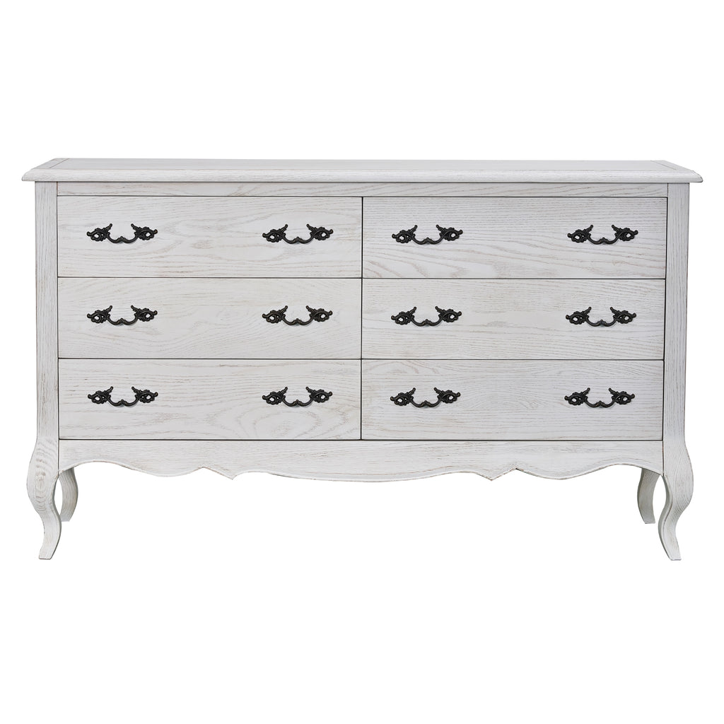 Designed in a vintage style, this dresser gives an elegant look to your bedroom. The dresser has 6 spacious drawers. The drawers have solid oak fronts and full extension runners. Black metal handles make it look stunning. Its structural frame is made of sustainably harvested solid and veneered oak wood. Standing strongly on solid wood cabriole legs, the fully assembled furniture in Antique White Distressed goes well with a variety of interior decor styles. It comes with a one-year warranty. The dresser has dimensions of W140 x D45 x H82 CM.