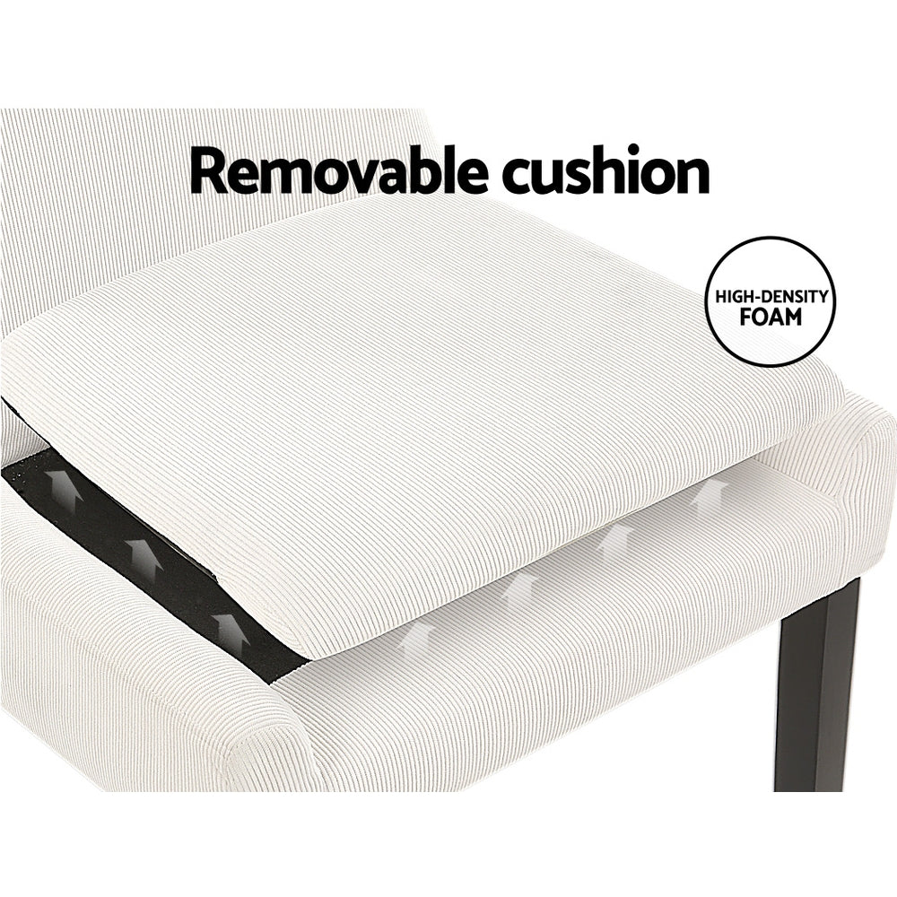 Elevate your dining experience with the Artiss 2-piece Tina Dining Chair Set. Crafted with premium corduroy upholstery, these chairs exude a modern and sophisticated charm. The sturdy rubber wood legs provide stability and durability, ensuring these chairs will stand the test of time. Featuring high-resilience foam, these chairs offer exceptional comfort and support, allowing you to enjoy long meals with family and friends. The anti-slip pads ensure the chairs stay securely in place, providing added safety and peace of mind. With removable cushions, cleaning and maintenance take no time at all, making these chairs a practical choice for any home. Assembly is a breeze, allowing you to enjoy your new dining chairs in no time. Elevate your dining space with our contemporary Artiss Tina Dining Chairs and create a stylish and inviting atmosphere for your guests.