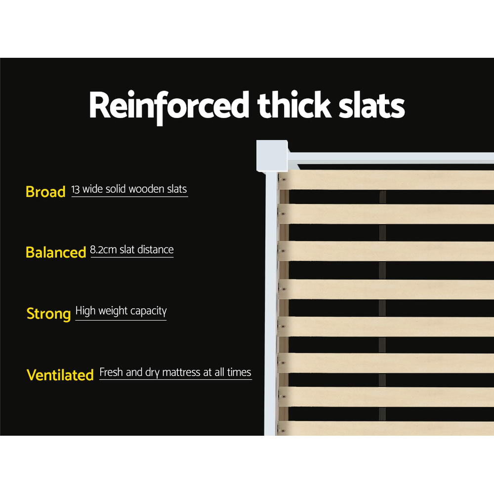 Made of natural pine wood, the Rio bed frame is ideal for your kids as it for any adult. Strong and sturdy, the bed frame comes with a solid timber slated base, stylish headboard, heavy duty steel fixings and smooth edges all round. Finished in a non-toxic, white paint, the neutral coloured bed frame makes for easy decoration coordination with any bedroom. The bed frame becomes an instant storage area with acres of space for your bedding essentials. Go extra neat and tidy. So create more and expand your home storage capacity with the Artiss Rio Bed Frame. Get yours today.