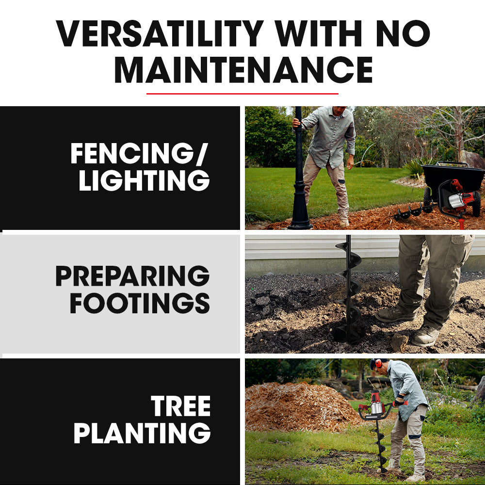 Baumr-AGs Electric Post Hole Digger includes premium features. It has anti-vibration ergonomic handles that are designed to absorb shock and reduce fatigue. They are also non-slip to assist in safely handling the tool. The aluminium motor casing and vibration absorbing nylon body work with a rigid steel chassis to deliver maximum torque to the shaft. The power safety lock prevents accidental power up of the BPX-500E Hole Digger.