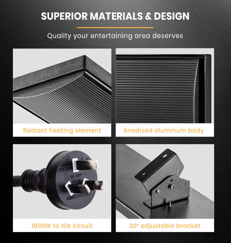 A 2000 watt electric element is embedded in the black anodised aluminium strip that rapidly produces even and gentle heat dispersion. Plus, unlike gas heaters there is no glow or glare, and no need to refuel.