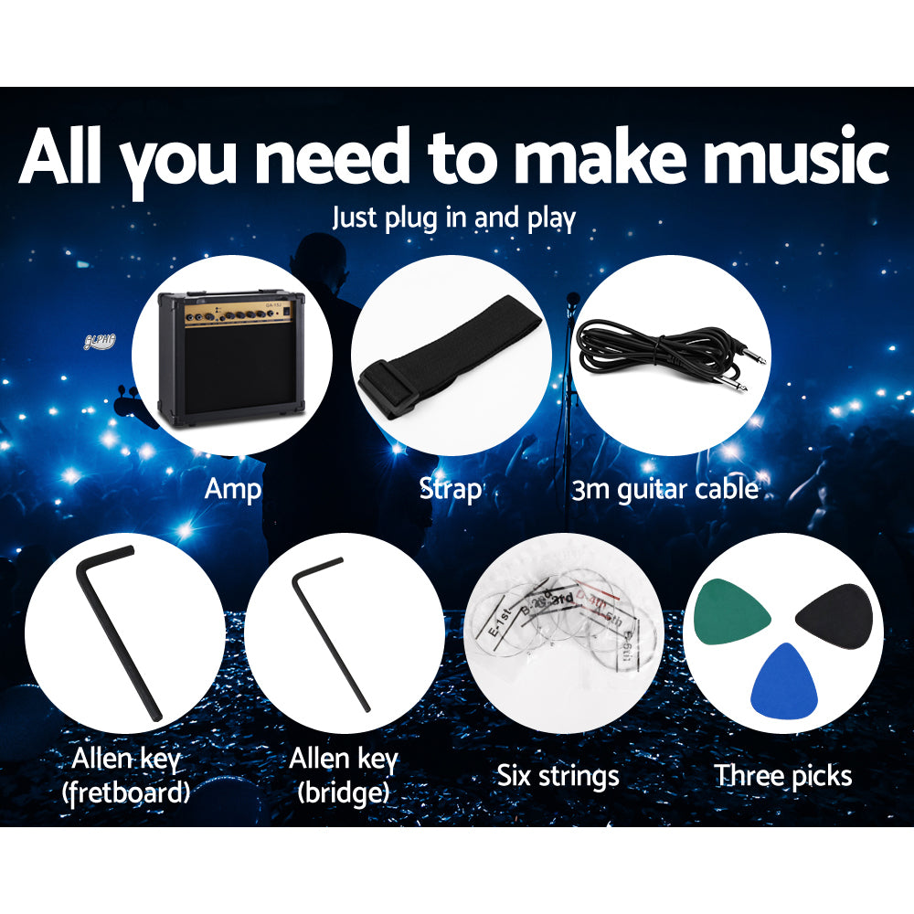 And to make things even easier for you to get started on your music escapades, our combo set also includes a 20W guitar amplifier with dual inputs and controls for bass, middlle, treble, gain. There is also a headphone input to stop the neighbours from complaining night and day. So rock on with the Alpha Electric Guitar Combo Set for heaps of awesome coolness. Get yours today.