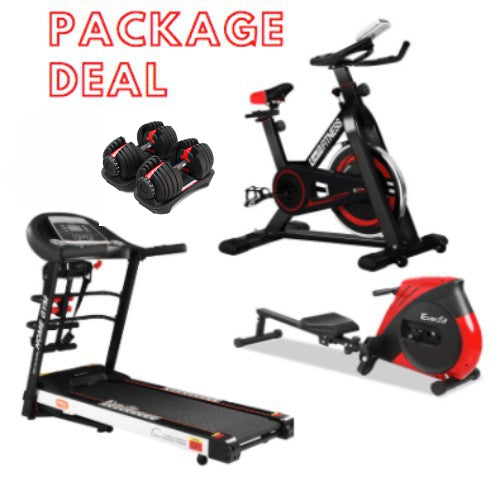 Combine the Everfit Treadmill, Spin Bike, Rowing Machine & Pair of adjustable 24kg Dumbells.