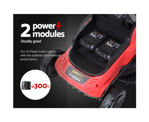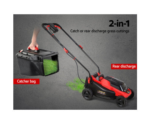 Two batteries instead of one. Double the power. Enhanced voltage, The Giantz Cordless Lawn Mower is all about getting your mowing done efficiently and conveniently without any wired hindrance. With 40V coming from twin rechargeable lithium batteries, the lightweight lawn mower gets the job done with ease. The batteries are also removable for easy storage. The mower comes with six height adjustments for the perfect cut from its 340mm cutting width. The handle is foldable too. Plus, it has a dual function too with its catcher bag and rear discharge capability. Getting started is as simple as pushing the start button. Better still, you do not have to contend with ear-shattering noise or irritating engine fumes as the mower works ever so quietly and free of polluted air. Perfect for a modest-sized lawn, the Giantz cordless lawn mower is certainly a cut above the rest.