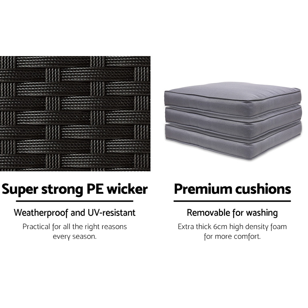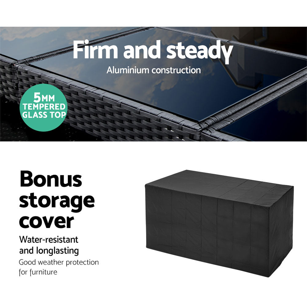As beautiful as ever with an enhanced design, our 5-Piece Outdoor Bar Set is the perfect addition to your backyard, deck, or patio. Featuring a modern and stylish look, the set includes a table and matching bar stools with ample seating for all your guests. The chairs have reclined backrests and plush 5cm thick foam cushions, allowing for comfortable socializing without any discomfort. The 5mm tempered glass tabletop and removable cushion covers make cleanup a breeze in case of spills. Constructed with powder-coated steel and high-quality PE wicker, this durable set can withstand any weather and includes a water-resistant cover for added protection. When not in use, the chairs can be easily stored under the table, thanks to its space-saving integrated design that fits together seamlessly like a puzzle.