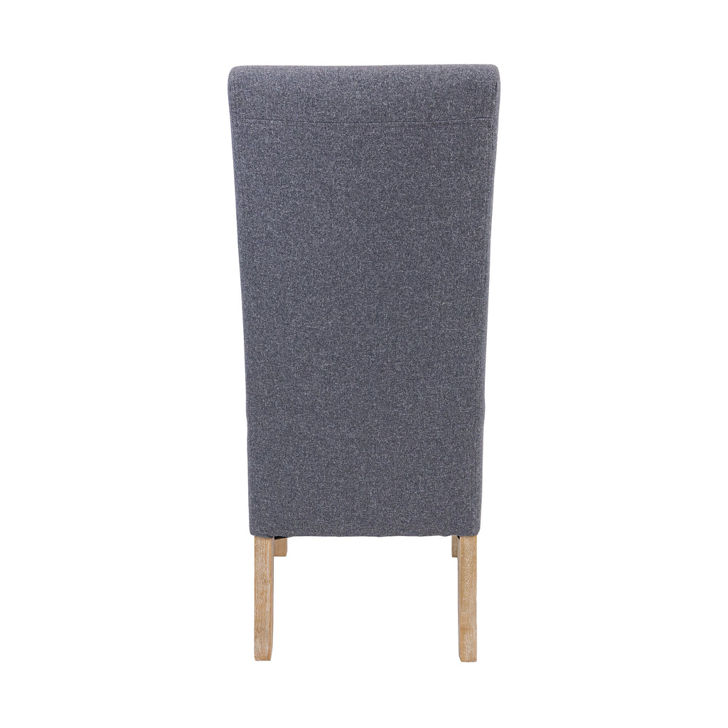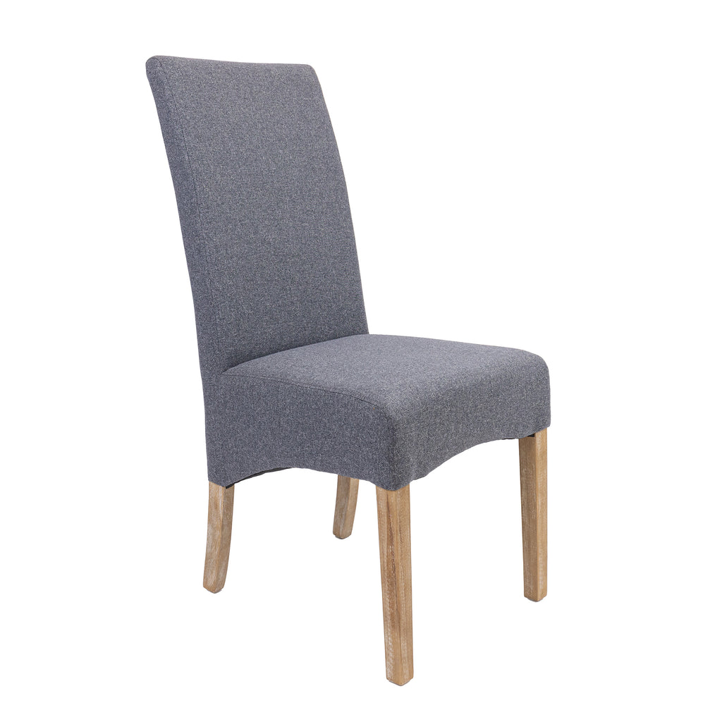 Upholstered dining chairs make your dining area look chic and luxurious. Decorate your place with these dining chairs designed in a contemporary style and enjoy the fresh look. The chair is upholstered in grey fabric and has strong legs made of rubberwood. A soft back makes it even more comfortable, giving it perfection. The chair looks stunning in all decor settings, thanks to its inviting shape and perfect cuts. A solid pine timber frame gives great inner strength to the chair, which comes with a one-year warranty.