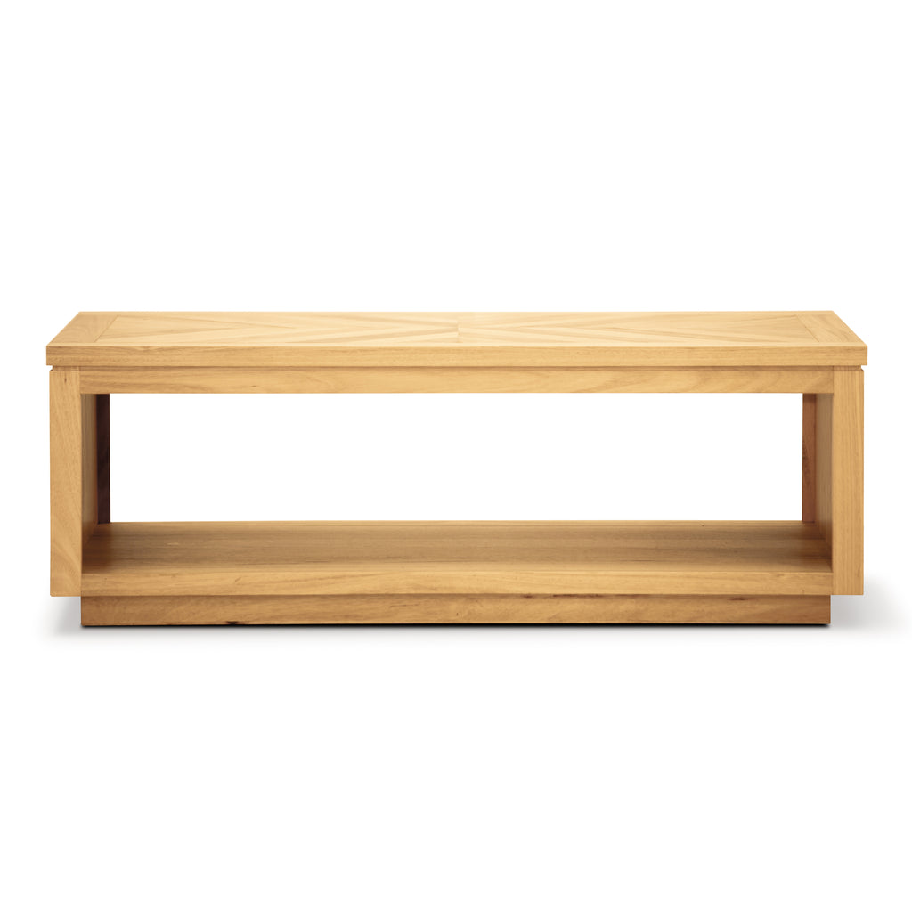 A centre table that attracts attention instantly due to its design. The lovely coffee table features Herringbone design, showcasing a beautiful geometric pattern, highlighting the natural grain of the wood, and this makes each furniture piece look unique. The table is designed in the Scandinavian-style, featuring innovative wood patterns and colour accents.It looks even more beautiful due to its natural colour with a clear lacquer finish. It also features a striking parquet top, which highlights the timber's beautiful colours and distinctive grain. The tabletop has a shadow gap which gives the appearance of a floating top, making it look amazing. The spacious coffee table with an open lower shelf is made of sustainably harvested solid and veneer messmate. A one-year warranty is included with the fully assembled coffee table.
